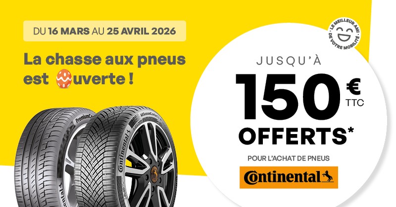 Du 16 mars au 25 avril 2026, profitez de notre offre jusqu’à 150€ offerts* pour l’achat de pneus de la marque Continental ou 120€ remboursés.